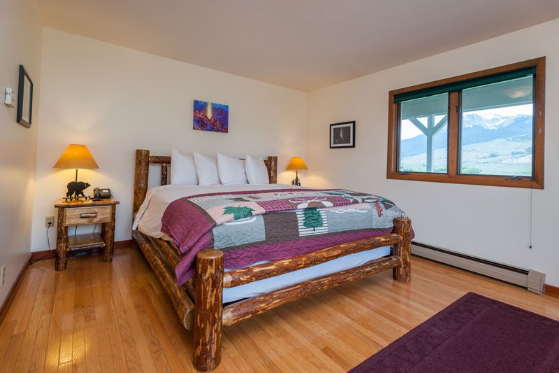 steps to access, NO ELEVATOR. Features real pine logs as ceiling and wall accents. Large window with view of Electric Peak Mountain. 1 king bed made of pine logs with additional pine furniture though out the room, includes a table with 2 chairs. Full bathroom with tub/shower unit. Microwave, mini frig, and keurig coffee maker.