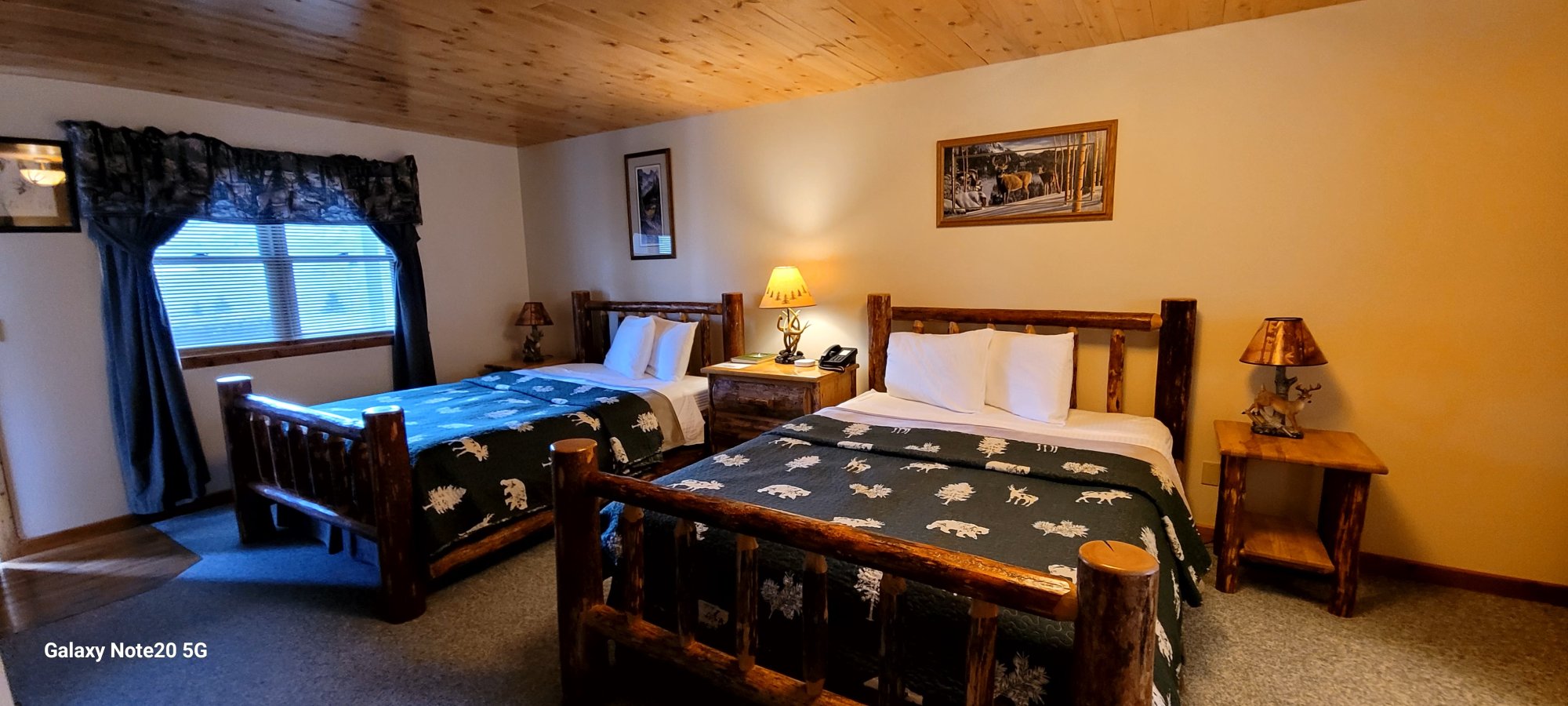 draped in the rich colors of maroon and forest green, two luxurious queen beds and Montana log furniture. Priced for 2, it can comfortably accommodate up to 4 with an additional charge of $30 per person, per night.