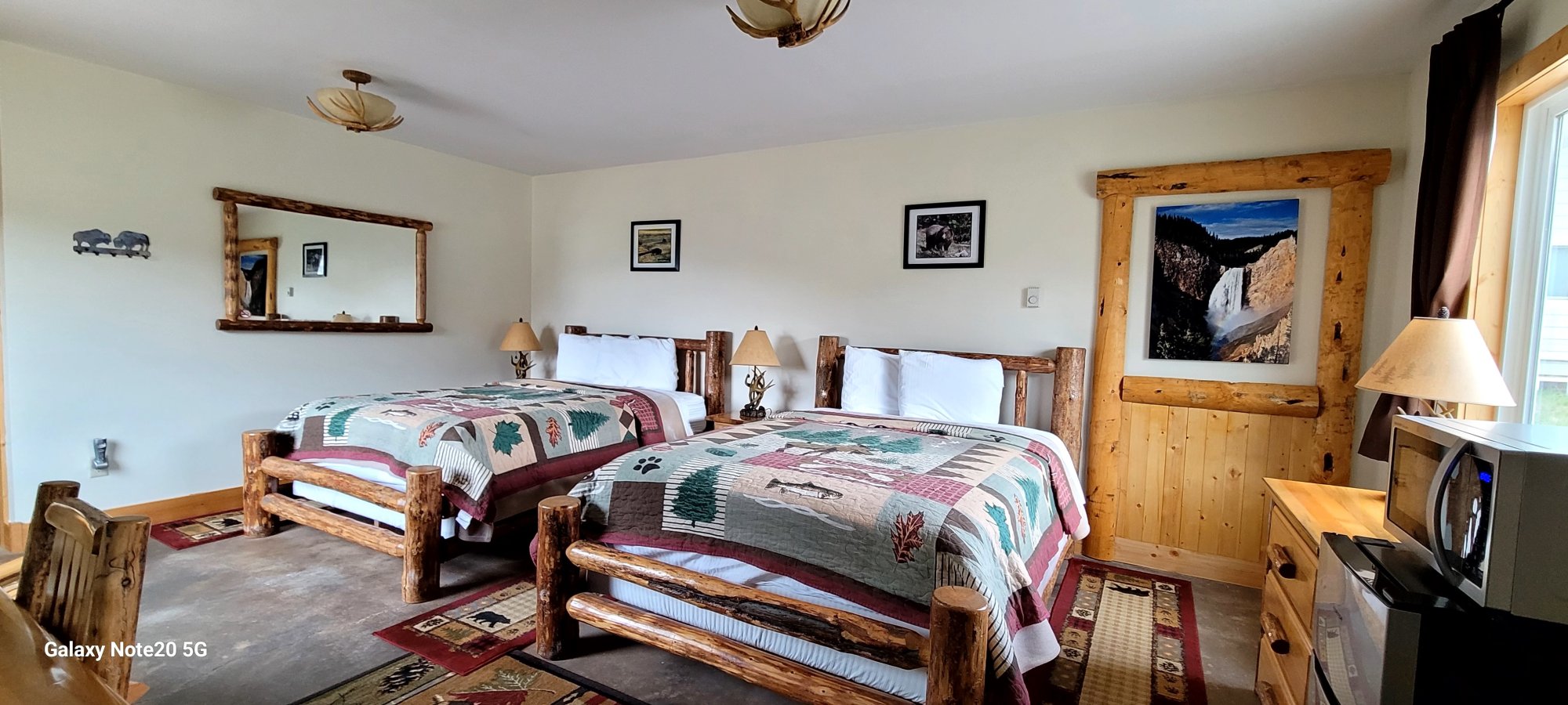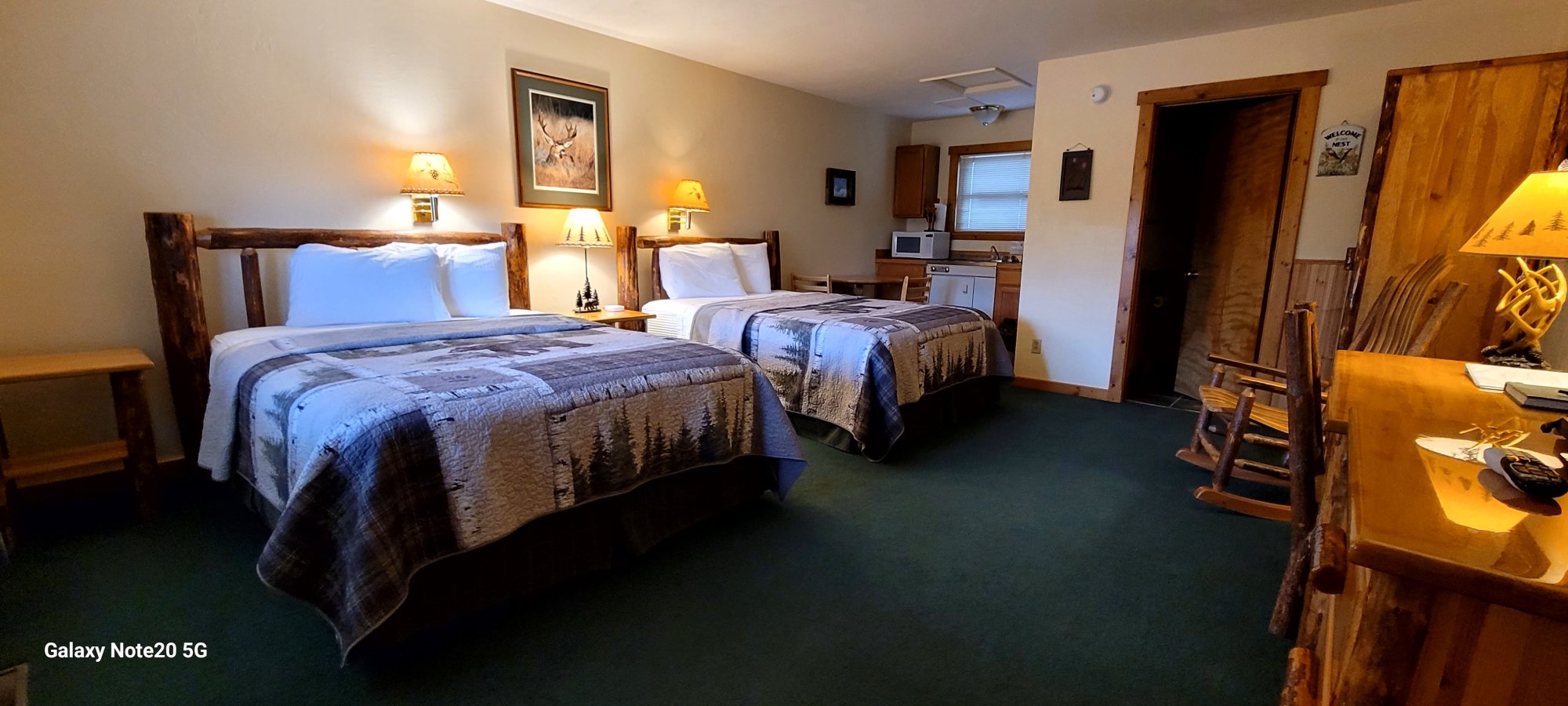 featuring two queen beds,Montana log furniture and a kitchenette for your convenience. Priced for 2, it can comfortably accommodate up to 4 with an additional charge of $30 per person, per night.